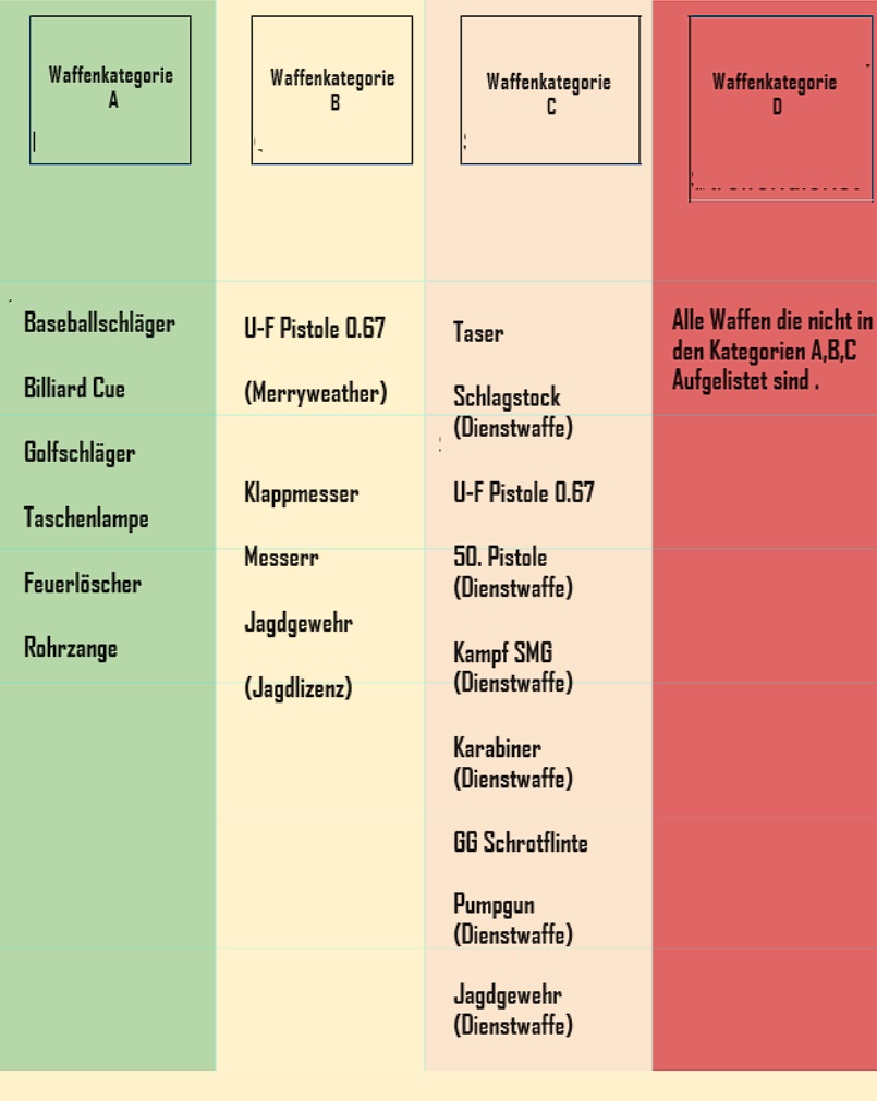 Die in der folgenden Tabelle gekennzeichneten Dienstwaffen, werden als illegal eingestuft, sollte diese von einem nicht Beamten des Police Department, Sheriff, US-Army, Marshals oder FIB getragen werden
